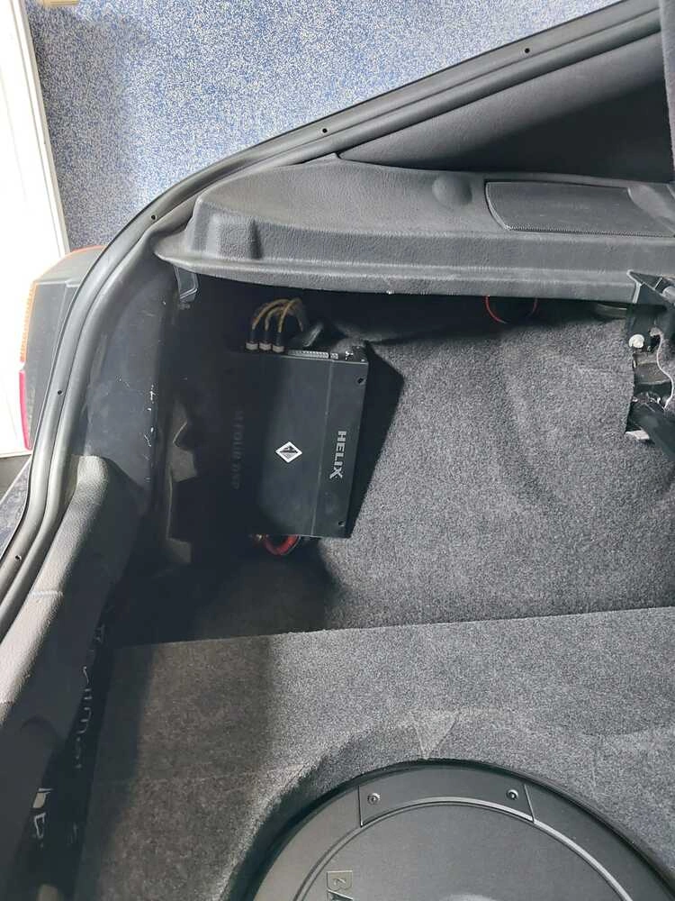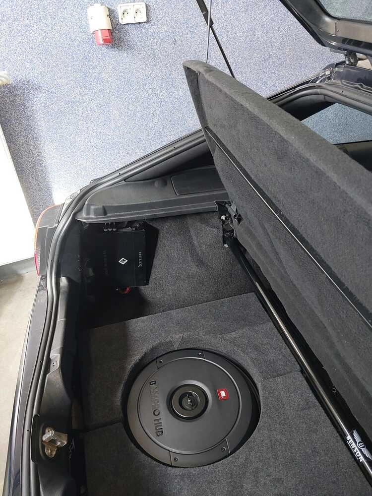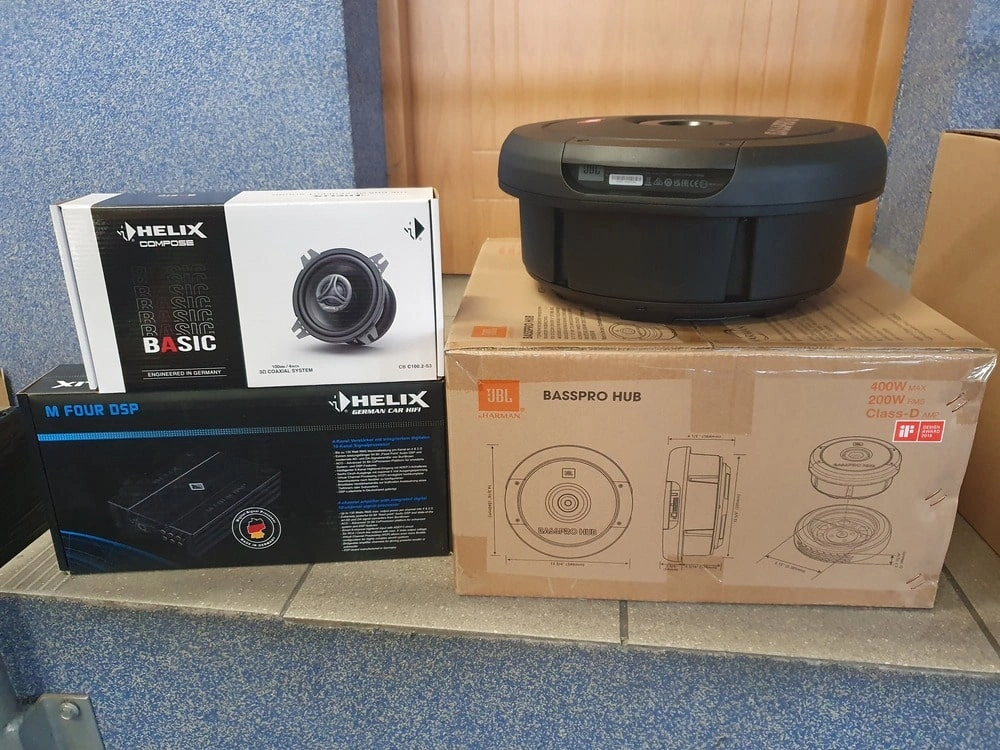 W takim układzie 4+2 wymieniliśmy głośniki na mocniejsze Helix serii i3, dołożyliśmy schowany aktywny subwoofer JBL HUB i całość napędziliśmy i zestroiliśmy za pomocą 4-kanałowego wzmacniacza z wbudowanym procesorem dźwięku DSP.