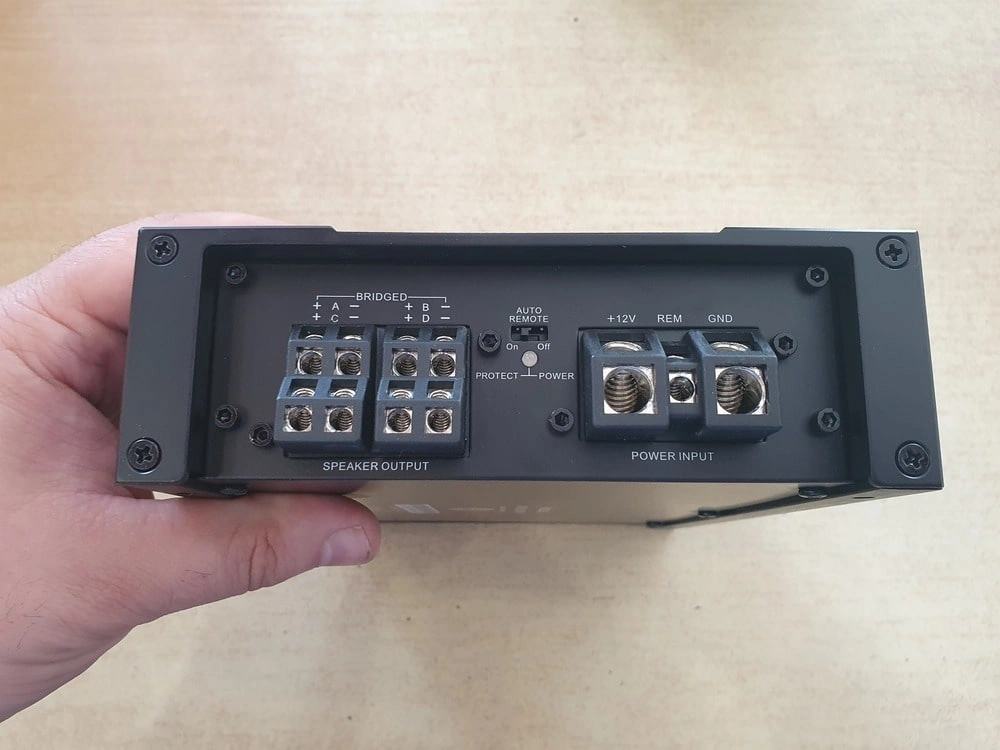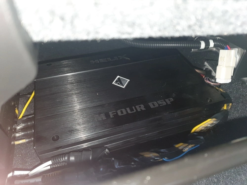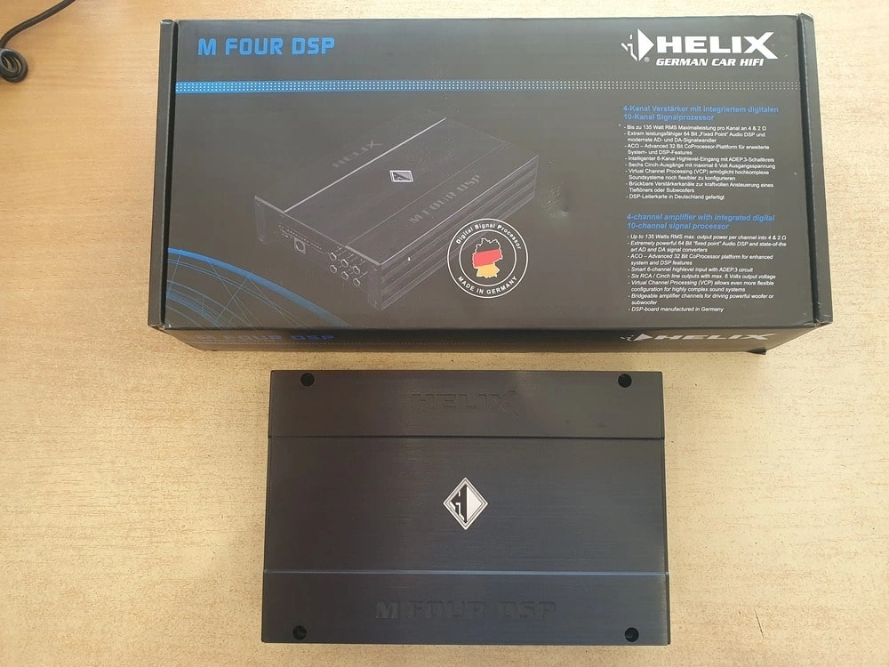 W naszym konkretnym przypadku wybraliśmy wzmacniacz Helix M Four 4-kanałowy z dodatkowym kanałem DSP na aktywny subwoofer.